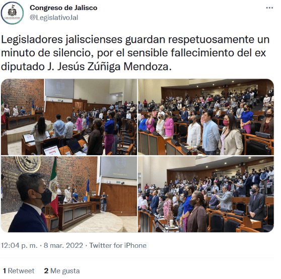 En el Congreso del Estado, diputados locales condenaron el asesinato de José de Jesús Zúñiga Mendoza quien fue integrante de la 62 Legislatura estatal.El coordinador de la fracción priista, Hugo Contreras Zepeda, lamentó los hechos en los que su compañero de partido fue privado de la vida en el municipio de Autlán. Lo recordó como un hombre de trabajo y servicio, comprometido con el sector cañero al que encabezó.“Que el Gobierno Federal y del Estado asuman su responsabilidad de garantizar a los mexicanos y a los jaliscienses, eso que tanta falta nos hace, la seguridad. Exigimos a los gobiernos federal y estatal resultados en la investigación de este hecho y en muchos otros más que se han suscitado en el país”, argumentó.Los priistas, Julio Covarrubias y Ana Angelita Degollado, se sumaron a la condena y demanda de justicia.El diputado de Hagamos, Enrique Velázquez González, lamentó el homicidio de su ex compañero de Legislatura y recordó que su nombre se suma a la lista de asesinatos registrados en esa región del Estado, donde en 2017 fue ultimado el ex legislador perredista Saúl Galindo, sin que haya resultado en la investigación; el asesinato en 2014 de Gabriel Michel ex presidente municipal de El Grullo; y el homicidio en enero pasado de José Luis Tello García ex alcalde de Tomatlán. Además, refirió el asesinato del ex diputado priista Javier Galván, originario de esa región, y el homicidio del ex gobernador Aristóteles Sandoval.“Todos los días nos encontramos con hechos de violencia y creo que es un momento para decir ya basta; se demuestra que no hay un plan de seguridad, están rebasadas las autoridades y tenemos un Estado violento”, manifestó.En sesión extraordinaria del Congreso estatal se guardó un minuto de silencio en memoria del ex legislador.GC
