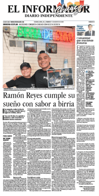 En la edición de INFORMAplus Edición Chicago de este domingo, podrías conocer, entre otros contenidos, cómo Ramón Reyes cumplió su idea de llevar a Chicago el platillo típico y original de Ocotlán, Jalisco. Después de casi 50 años, “Birriería Ocotlán” es un lugar legendario en la “Ciudad de los Vientos”.Recuerda que INFORMAplus Edición Chicago tiene el objetivo de resaltar los logros y experiencias de los mexicanos en esa ciudad norteamericana y llevar a nuestros paisanos un pedacito de México.Te invitamos a descubrir esta edición especial a través de la aplicación de EL INFORMADOR en donde tendrás acceso a este y otros contenidos exclusivos como nuestros suplementos especiales, Gente Bien y la edición diaria de los Juegos Olímpicos Tokio 2020.INFORMAPLUS ofrece una experiencia de lectura única, jerarquizada y editada como en nuestra versión impresa, pero con los valores y herramientas de una versión digital hojeable, como leerlo en formato de página o por nota, marcar o compartir tus favoritos, copiar contenidos e incluso, si lo prefieres, escucharlos.Descarga INFORMAPLUS y disfruta de 30 días de prueba gratis. Una vez que te suscribas podrás recibir cuatro tarjetas de CÍRCULO INFORMADOR que podrás repartir entre tus amigos y familiares para que disfruten de los beneficios exclusivos de este programa.Descárgala y pruébala sin costoiOS https://apple.co/38sopZ0Android https://bit.ly/3cjcLRh