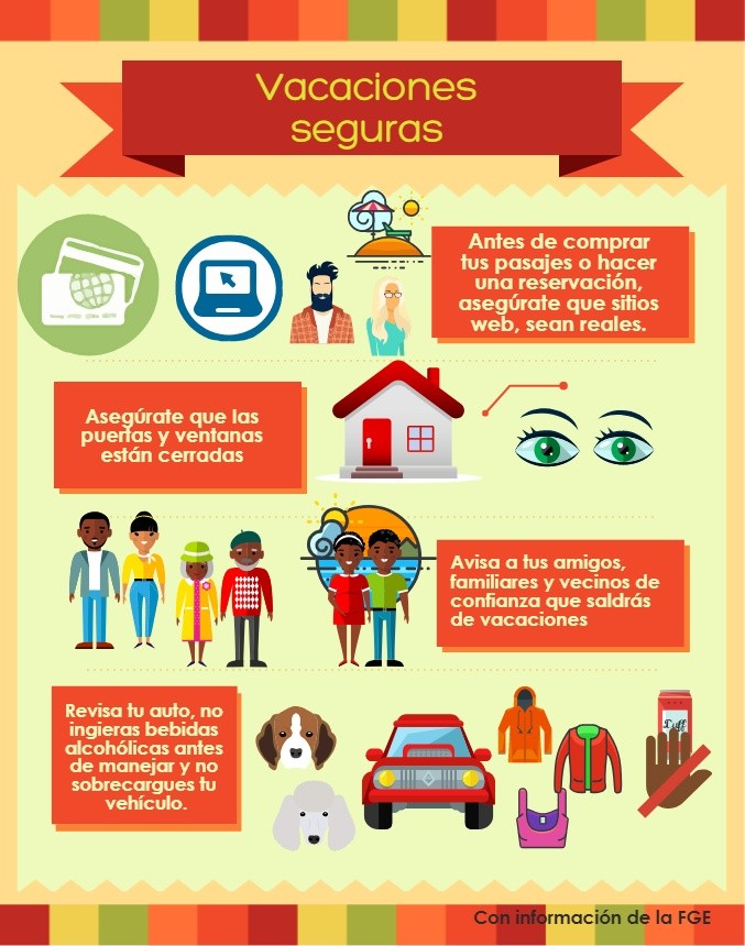 Antes de salir de tu casa rumbo a tus vacaciones es importante tomar algunas medidas de seguridad para evitar atracos o fraudes mientras estás disfrutando de tu descanso.La Fiscalía General de Jalisco, realizó una lista de recomendaciones para tener unas vacaciones seguras en las que destacan no hacer compras por internet si no tienes la certeza de que el sitio web es oficial.En esta Semana Santa, la policía de Guadalajara ha detenido a seis personas por robos a casa habitación. NM