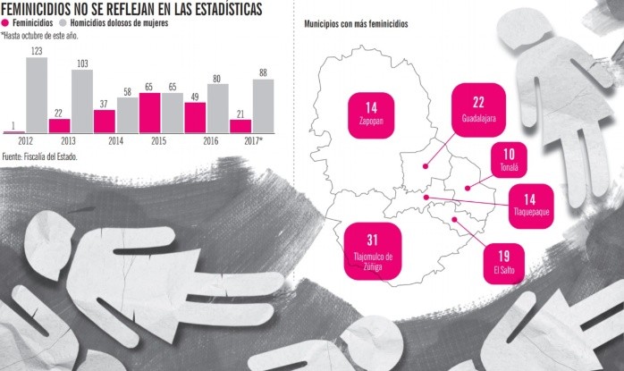 A los ojos de los demás, la relación de Sara parecía sana. Su pareja se mostraba de manera pública como una persona agradable, pero en lo privado el hombre se tornaba violento. Esta situación se mantuvo durante cuatro años. “Me agredía diario, muchísimas veces”, contó la afectada. El día en que su hija fue la víctima, pidió ayuda. El agresor no fue sancionado y el caso concluyó con un acuerdo a través de la justicia alternativa. De acuerdo con la Fiscalía, desde agosto de 2015 la Unidad Especializada para la Atención de Violencia contra las Mujeres ha registrado más de 14 mil averiguaciones previas y carpetas de investigación por algún tipo de agresión o maltrato. Sin embargo, solamente 7% ha llegado a la consignación. De las denuncias presentadas, 80% corresponde a violencia intrafamiliar. Para Rubén Ortega, investigador de la Universidad de Guadalajara (UdeG), el porcentaje de impunidad que muestran las estadísticas de la dependencia estatal demuestra la falta infraestructura y capacitación de personal en otros municipios que no forman parte de la metrópoli y en los que habitan mujeres que son violentadas. En este sentido, Guadalupe Ramos, integrante del Comité de América Latina y el Caribe para la Defensa de los Derechos de las Mujeres (Cladem), explicó que las autoridades no cuentan con los elementos para atender los casos que se generan diariamente. “Desde el primer día nace rebasado. La práctica común era que las mandaban, antes de que llegaran al Ministerio Público a presentar su denuncia, al Instituto de Justicia Alternativa para tratar de conciliar, cuando eso es algo que además no está permitido. Los procesos de violencia contra las mujeres no pueden ser objeto de conciliación ni de mediación”.Este medio de comunicación buscó a la titular de la Unidad Especializada para la Atención de Violencia contra las Mujeres. Hasta el cierre de esta edición no se obtuvo respuesta. Combate a la violenciaMarzo, el mes de la mujer, es en el que cada año, desde 2012 a la fecha, hay más casos de feminicidios registrados.De los 195 feminicidios que se han registrado desde que se tipificó esta figura en el Estado en 2012, Tlajomulco es el municipio en donde más víctimas ha habido: 31. Guadalajara y El Salto ocupan el segundo y tercer lugar en casos con 22 y 19, respectivamente.Al respecto, Carlos Burguete, comisario de la Policía de Tlajomulco, atribuye este indicador a la alta concentración de población y a la marginación. “Definitivamente tenemos identificadas las zonas con mayor incidencia de familias disfuncionales con problemas de adicción y de alcoholismo”.Detalló que Lomas del Mirador, Santa Fe, Chulavista y Aqua son las colonias que con más problemas de violencia intrafamiliar y violencia contra las mujeres.Una de las medidas que implementa Tlajomulco para combatir este problema es el programa Mujer Segura, que se compone de nueve personas disponibles las 24 horas para recibir reportes de violencia y asistir a los domicilios a brindar apoyo, aunque reconoció que hace falta fortalecer el equipo con más estado de fuerza. Dijo que van más de 200 visitas de esta naturaleza en esta administración y hay 180 mujeres con órdenes de protección en este municipio.Además, destacó que implementan 18 tipos de cursos como Vecinos en alerta, Aprendiendo a cuidarte, además de terapia psicológica y asesoría legal para las mujeres violentadas.¿A dónde llamar? El teléfono a donde se puede llamar en Tlajomulco para pedir ayuda en caso de violencia al Centro de Interconexión es el 32 83 45 45.FALTA INVESTIGACIÓN EN LOS CASOS PARA TIPIFICAR EL DELITOSi bien la Fiscalía registra que los feminicidios en la Entidad disminuyeron durante el año pasado, los homicidios dolosos de mujeres aumentaron. De acuerdo con la dependencia estatal, estos últimos pasaron de 67 entre enero y octubre de 2016, a 88 en el mismo periodo de 2017. En comparación, en un lapso similar los feminicidios cayeron de 42 a 21.Sin embargo, Guadalupe Ramos, coordinadora del Comité de América Latina y el Caribe para la Defensa de los Derechos Humanos de la Mujer (Cladem), resaltó que el número de mujeres asesinadas se incrementa año con año. Explicó que esta situación no se refleja en las estadísticas de la autoridad porque no se investiga adecuadamente y los casos se consignan como homicidios o parricidios. “Independientemente de que se les consigne como feminicidios, homicidios o parricidios, para las familias, son hermanas, hijas y mamás que fueron asesinadas”, agregó. En ambos delitos, son mujeres entre 18 y 30 años las víctimas más comunes. Hay 25 niñas menores de nueve años. Ramos señaló que el promedio de edad de las víctimas ha ido disminuyendo y los asesinos tienen distintas motivaciones de acuerdo con las etapas de la vida de las mujeres. “En las bebés y niñas es la violencia sexual y en adultas mayores puede ser el robo, aunque estos delitos terminan en la mayoría de los casos también con una violación y la muerte”.La impunidad es el principal problema, destacó la experta. Acentuó que en más de 98% de los casos no se detiene al responsable, aunque se tenga su información. “En el caso de las mujeres que sabes quién las asesino que fue su novio, ex novio, pareja, concubino. Cuando es alguien conocido aun así no los encuentran. Hay casos representativos sin resolver como el de Gaby, Betsabé, Alondra, donde los culpables siguen prófugos”.Punteros, Zapopan y GuadalajaraZapopan y Guadalajara están a la cabeza de los homicidios dolosos de mujeres con 101 y 100 casos, respectivamentePara Guadalupe Ramos Ponce, integrante del Comité de América Latina y el Caribe para la Defensa de los Derechos de las Mujeres (Cladem), hace falta que mejore la atención para las mujeres que son víctimas de violencia y que habitan en municipios que no forman parte de la Zona Metropolitana de Guadalajara (ZMG). “Lo que está muy desc