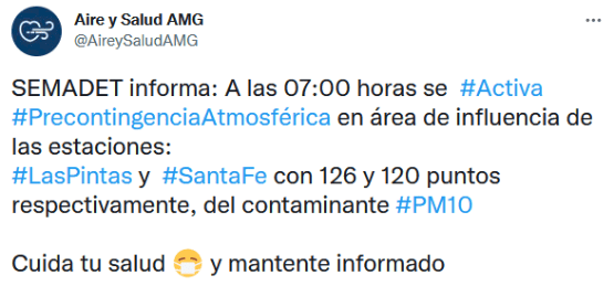 La Secretaría de Medio Ambiente y Desarrollo Territorial (Semadet) activó la mañana de este martes la precontingencia atmosférica en las estaciones de Santa Fe, en el municipio de Tlajomulco, y Las Pintas, de Tlaquepaque.De acuerdo a información de la Semadet, a las 10:00 horas de hoy, el Índice Metropolitano de la Calidad del Aire (Imeca) en la estación de Santa Fe es de 120 puntos, mientras que en Las Pintas es de 126 puntos.El Gobierno del Estado pidió a la ciudadanía que tome en cuenta las siguientes recomendaciones, esto por la presencia de humo que hay en toda la ZMG: