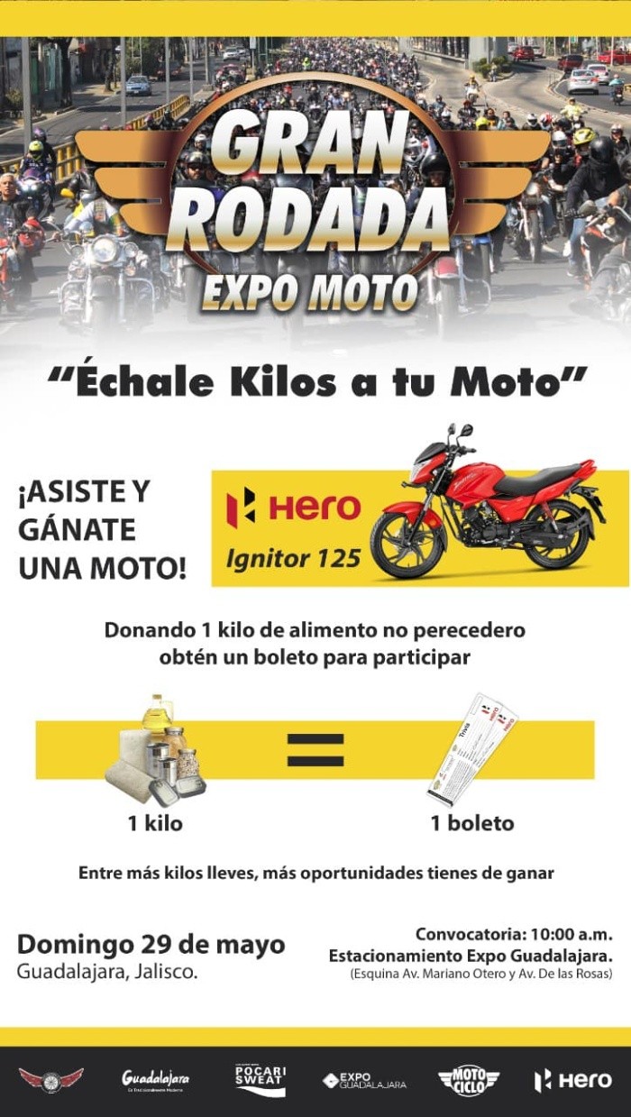 Con la meta de recoletar alimentos no perecederos, este domingo 29 de mayo se realizará en Guadalajara la rodada “Échale Kilos a Tu Moto” que busca despertar el altruismo de los amantes de las motocicletas para ayudar a personas de escasos recursos.“Recaudaremos toneladas de alimento no perecedero que serán entregados a la fundación Expo Guadalajara. Invitamos a todo el público en general de la ciudad, a donar kilos de arroz, fríjol, lentejas y alimentos no perecederos. Por cada kilo que dones, te regalamos un boleto para ganarte una moto Hero” refiere la invitación al evento organizado por Expo Moto.La recepción de donaciones iniciará desde las diez de la mañana en el escenario de “Expo Moto” que se ubicará en el estacionamiento de Expo Guadalajara; por cada kilo de alimento donado se obtendrá un boleto para participar y ganarse la motocicleta.La rodada partirá desde la Expo, comenzará a las once de la mañana, circularán por algunas de las principales calles y avenidas de la ciudad; el recorrido durará una hora.Tras la rodada, los participantes retornarán al escenario de Expo Moto donde se realizará la mecánica de la trivia para seleccionar al ganador de la motocicleta Hero Ignitor 125.EXPO MOTO Guadalajara está lista para realizarse del 2 al 5 de junio, se trata de la plataforma comercial más importante del país, enfocada a la generación de negocios en el ámbito de las dos ruedas y vehículos off road.EXPO MOTO celebra su primera edición en Expo Guadalajara, busca brindar una serie de beneficios puntuales a sus expositores, que se reflejarán en un aumento sustancial de sus ventas y generación de contactos de negocios del mercado internacional de la motocicleta.JM
