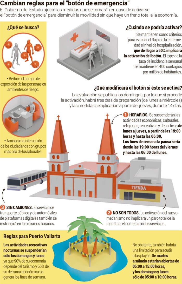 Aunque la prioridad es aplicar acciones que prevengan contagios de COVID-19, el alcalde de Zapopan, Pablo Lemus Navarro, informó que de activarse el “botón de emergencia” habrá cero tolerancia para los negocios que incumplan con el protocolo “reestructurado”.Destacó que si éste se activa, o bien, que se rebase el 50% de ocupación hospitalaria o los casos activos superen los 400 por millón de habitantes, el municipio aplicará operativos en coordinación con la Comisaría de Seguridad, Inspección y Vigilancia y Reglamentos, y de encontrar negocios que no cumplan con lo dispuesto, serán clausurados. Así, quienes no cumplan con los horarios establecidos en el protocolo (entre semana hasta las 19:00 horas y los fines de semana sólo giros relacionados con el sector alimenticio), recibirán una sanción.“Todo lo que sea de primera necesidad, como farmacias o tiendas de conveniencia, sí estaría operando, aunque todavía no se ha dictaminado el horario máximo, pero en esas excepciones podría llegar hasta las 21:00 horas”. En las industrias no habría cambios, pero sólo para aquellas que laboren hasta las 19:00 horas. Éstas también serían clausuradas si incumplen con los lineamientos. “No podemos seguir jugando al gato y al ratón. Los empresarios deben entender que ellos también son los responsables de evitar estos contagios”.El alcalde de Guadalajara, Ismael Del Toro, y el coordinador de Desarrollo Económico, Alejandro Guzmán, coincidieron en que lo primordial es reforzar las medidas de prevención para evitar que se incrementen los contagios.“El botón de emergencia no es un toque de queda. A nadie nos conviene que se oprima y tenemos oportunidad de evitarlo si trabajamos en conjunto”, expresó Guzmán.Tras reconocer que el Gobierno estatal y los municipales están rebasados en la relación inspectores-comercios, se presentó la estrategia “Visor Ciudadano COVID-19”, mediante la cual la sociedad podrá vigilar que se cumplan los protocolos sanitarios para evitar contagios en los negocios de la ciudad.La estrategia involucra también a las cámaras de Comercio, Industrial y Restaurantera, y la meta es aumentar las medidas sanitarias en restaurantes, bares y tianguis.Los “visores ciudadanos” serán voluntarios inscritos en dichas cámaras que estarán identificados con gafetes. Podrán hacer apercibimientos verbales a negocios que no respeten los horarios de cierre o aforos permitidos, no apliquen filtros sanitarios o que sus trabajadores no usen correctamente el cubrebocas.De no atender la solicitud, ellos harán el reporte y el comercio estará registrado en una base de datos, además de que será sancionado.Los giros que no frenarán: