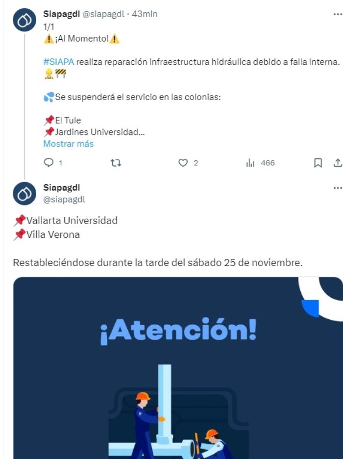 La tarde de este viernes, el Sistema Intermunicipal de los Servicios Agua Potable y Alcantarillado (Siapa) reportó un corte de agua en la Zona Metropolitana de Guadalajara por lo que se verán afectadas 10 colonias con el servicio. Siapa reportó a través de su cuenta “X”, antes Twitter, que se encuentra en reparación una infraestructura hidráulica debido a una falla interna. Por este motivo las siguientes colonias presentarán corte de agua: De acuerdo con el Siapa, el servicio se restablecerá durante la tarde del sábado 24 de noviembre. Ante cualquier duda o aclaración, el Siapa pone a disposición los siguientes medios para que resuelvas tus preguntas.*Mantente al día con las noticias, únete a nuestro canal de WhatsApp MF