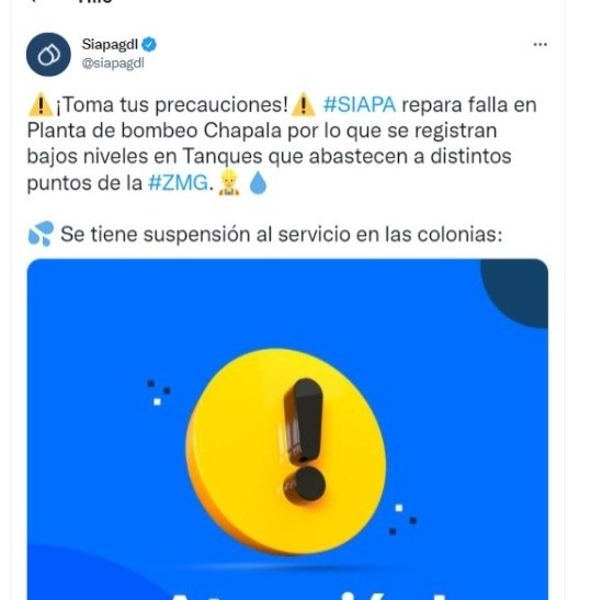 El Sistema Intermunicipal de los Servicios de Agua Potable y Alcantarillado (SIAPA) informó la noche del miércoles que en al menos 120 colonias de la Zona Metropolitana de Guadalajara fue suspendido el servicio.El organismo explicó que realizan la reparación de una falla en la llanta de bombeo Chapala "por lo que se registran bajos niveles en Tanques que abastecen a distintos puntos de la Zona Metropolitana."Una vez que se repare el problema y se restablezca la energía eléctrica se estará restableciendo el suministro paulatinamente", añadió la dependencia en redes sociales. servicio.ACTUALIZACIÓN (17 de marzo 12:25 pm): El SIAPA informó en redes sociales que "ya se restableció la energía eléctrica en la subestación y la red de abastecimiento se encuentra en recuperación el día de hoy y hasta la tarde del viernes 18 de marzo".Por lo que se espera que a más tardar mañana regrese el servicio de agua en las siguientes colonias: