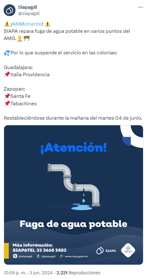 El Sistema Intermunicipal de los Servicios Agua Potable y Alcantarillado (Siapa) informó que hoy lunes 3 de junio se reparan fugas en diferentes puntos de la Zona Metropolitana de Guadalajara, por lo que suspenderán el servicio en 3 colonias.Las afectadas serán Italia Providencia en Guadalajara; así como Santa Fe y Tabachines en Zapopan.En sus redes sociales, el Siapa indicó que el servicio se restablecerá en el transcurso de la mañana del martes 4 de junio.Ante cualquier duda o aclaración, el Siapa pone a disposición los siguientes medios para que resuelvas tus preguntas.*Mantente al día con las noticias, únete a nuestro canal de WhatsAppOF