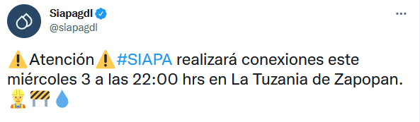 El Sistema Intermunicipal de los Servicios de Agua Potable y Alcantarillado (SIAPA) anunció la mañana de hoy miércoles que habrá corte de agua para cuatro colonias del municipio de Zapopan.A través de redes sociales, el SIAPA informó a las 08:22 horas de hoy que personal realizará conexiones en la colonia La Tuzanía, del municipio antes mencionado. Estos trabajos comenzarán a las 22:00 horas de hoy miércoles 3 de noviembre.Debido a esto, se deberá suspender el servicio en cuatro colonias de Guadalajara a partir de la hora antes mencionada; se prevé que el servicio del agua regrese durante la noche del jueves 4 de noviembre. El SIAPA invitó a la gente a realizar distintas acciones para el uso responsable y óptimo del aguaAnte cualquier duda o aclaración, el SIAPA pone a disposición los siguientes medios para que resuelvas tus preguntas. Facebook: siapagdl Twitter: siapagdl SIAPATEL: 3336682482GC