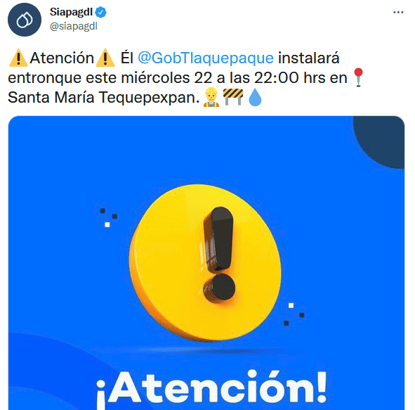 El Sistema Intermunicipal de los Servicios de Agua Potable y Alcantarillado (SIAPA) anunció ayer martes que habrá corte de agua para ocho colonias del municipio de Tlaquepaque. A través de redes sociales, el SIAPA informó la tarde de ayer que personal del SIAPA instalará un entronque este miércoles 22 de diciembre a las 22:00 horas en la colonia Santa María Tequepexpan. Debido a esto, se deberá suspender el servicio en ocho colonias de Tlaquepaque a partir de la hora antes mencionada; se prevé que regrese durante la noche del jueves 23 de diciembre. El SIAPA invitó a la gente a realizar distintas acciones para el uso responsable y óptimo del aguaAnte cualquier duda o aclaración, el SIAPA pone a disposición los siguientes medios para que resuelvas tus preguntas. Facebook: siapagdl Twitter: siapagdl SIAPATEL: 3336682482GC