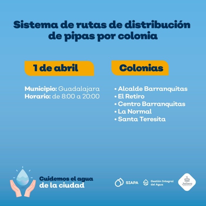 Ante la baja presión de agua que prevalece en algunas colonias de la Zona Metropolitana de Guadalajara, el Sistema Intermunicipal de los Servicios de Agua Potable y Alcantarillado (SIAPA) continúa con el sistema de rutas de pipas gratuitas por colonia implementado desde el pasado 18 de marzo.La distribución de pipas tiene el objetivo de minimizar las afectaciones a las colonias que se encuentran dentro del operativo de suministro rotatorio. Las zonas de cobertura y horarios de la flota de pipas para este jueves 1 de abril es el siguiente:La distribución estará dentro de un horario de 08:00 a 20:00. Ante el desabasto de agua, el SIAPA exhorta a cuidar el vital líquido.NR