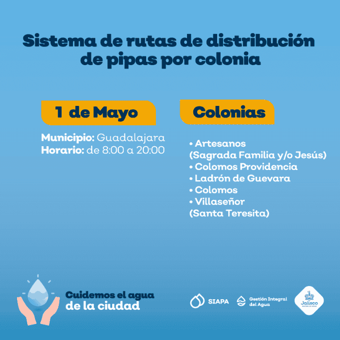 Ante la baja presión de agua que prevalece en algunas colonias de la Zona Metropolitana de Guadalajara (ZMG), el Sistema Intermunicipal de los Servicios de Agua Potable y Alcantarillado (SIAPA) continúa con el sistema de rutas de pipas gratuitas implementado desde el pasado 18 marzo. Este día se atenderá a cinco colonias de Guadalajara.La distribución de pipas tiene el objetivo de minimizar las afectaciones a las colonias que se encuentran dentro del operativo de suministro rotatorio, estrategia diseñada debido a la escasez de agua en la Presa Calderón.Las zonas de cobertura y horarios de la flota de pipas para este sábado 1 de mayo es el siguiente:La distribución estará dentro de un horario de 08:00 a 20:00 horas. Ante el desabasto de agua el SIAPA exhorta a cuidar el vital líquido.El SIAPA informó que hasta el último corte del jueves 29 de abril, ha recibido 31 mil reportes y atendido 29 mil 209 en colonias de Tonalá, Tlaquepaque, Guadalajara y Zapopan. A su vez, se han colocado 143 cisternas comunitarias, de 10 mil litros de capacidad, en colonias de las zonas altas que cada año han tenido deficiencias en el servicio: 116 Zapopan, 13 en Guadalajara, 11 en Tonalá y tres en Tlaquepaque.Para solicitar el servicio de pipas gratuitas se requiere:También se puede llamar a la línea telefónica SIAPATEL 3668-2482 con atención las 24 horas del día. Para consultar cisternas se puede ingresar a: gobjal.mx/Cisternas.Asimismo, el SIAPA pone a disposición sus redes sociales en Twitter: @siapagl y Facebook: siapagdl para brindar información sobre el sistema de rutas de distribución de pipas gratuitas por colonia y el SIAPATEL para denuncias.NR