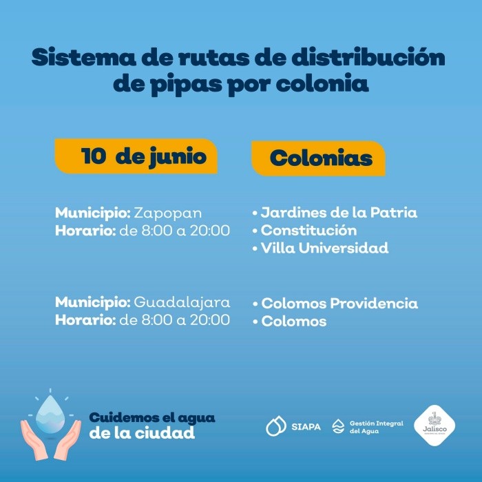 El Sistema Intermunicipal de los Servicios de Agua Potable y Alcantarillado (SIAPA) continúa con el sistema de rutas de pipas gratuitas por colonia implementado desde el pasado 18 de marzo, debido a que prevalece la baja presión de agua en algunas áreas de la Zona Metropolitana de Guadalajara (ZMG).Este día la flota de pipas acudirá a cinco colonias de los municipios de Zapopan y Guadalajara.La distribución de pipas tiene el objetivo de minimizar las afectaciones a las colonias que se encuentran dentro del operativo de suministro rotatorio, estrategia diseñada debido a la escasez de agua en la Presa Calderón.Las zonas de cobertura y horarios de la flota de pipas para este jueves 10 de junio son los siguientes:La distribución estará dentro de un horario de 08:00 a 20:00 horas. Ante el desabasto de agua el SIAPA exhorta a cuidar el vital líquido.El SIAPA informó además que ha colocado 143 cisternas comunitarias, de 10 mil litros de capacidad, en colonias de las zonas altas que cada año han tenido deficiencias en el servicio: 116 Zapopan, 13 en Guadalajara, 11 en Tonalá y tres en Tlaquepaque. Para consultar la ubicación de cisternas se puede ingresar a: gobjal.mx/Cisternas. Para solicitar el servicio de pipas gratuitas se requiere:También se puede llamar a la línea telefónica SIAPATEL 3668-2482 con atención las 24 horas del día.Asimismo, el SIAPA pone a disposición sus redes sociales en Twitter: @siapagl y Facebook: siapagdl para brindar informado sobre el sistema de rutas de distribución de pipas gratuitas por colonia y el SIAPATEL para denuncias (33 3668 2482).NR