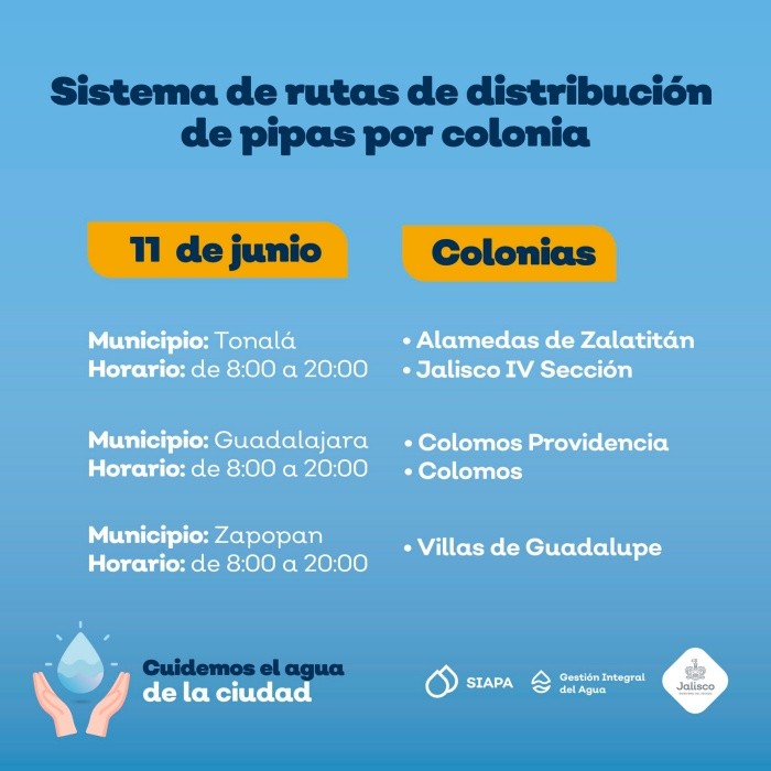 Ante la baja presión de agua que prevalece en algunas colonias de la Zona Metropolitana de Guadalajara (ZMG), el Sistema Intermunicipal de los Servicios de Agua Potable y Alcantarillado (SIAPA) continúa con el sistema de rutas de pipas gratuitas implementado desde el pasado 18 marzo. Este día se atenderá a cinco colonias de Guadalajara, Tonalá y Zapopan.La distribución de pipas tiene el objetivo de minimizar las afectaciones a las colonias que se encuentran dentro del operativo de suministro rotatorio, estrategia diseñada debido a la escasez de agua en la Presa Calderón.Las zonas de cobertura y horarios de la flota de pipas para este viernes 11 de junio son los siguientes:La distribución estará dentro de un horario de 08:00 a 20:00 horas. Ante el desabasto de agua el SIAPA exhorta a cuidar el vital líquido.El SIAPA informó además que ha colocado 143 cisternas comunitarias, de 10 mil litros de capacidad, en colonias de las zonas altas que cada año han tenido deficiencias en el servicio: 116 Zapopan, 13 en Guadalajara, 11 en Tonalá y tres en Tlaquepaque. Para consultar la ubicación de cisternas se puede ingresar a: gobjal.mx/Cisternas.Para solicitar el servicio de pipas gratuitas se requiere:También se puede llamar a la línea telefónica SIAPATEL 3668-2482 con atención las 24 horas del día.Asimismo, el SIAPA pone a disposición sus redes sociales en Twitter: @siapagl y Facebook: siapagdl para brindar informado sobre el sistema de rutas de distribución de pipas gratuitas por colonia y el SIAPATEL para denuncias (33 3668 2482).NR