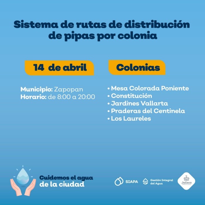 El Sistema Intermunicipal de los Servicios de Agua Potable y Alcantarillado (SIAPA) continúa con el sistema de rutas de pipas gratuitas por colonia implementado desde el pasado 18 de marzo, debido a que prevalece la baja presión de agua en algunas áreas de la Zona Metropolitana de Guadalajara (ZMG).Este día la flota de pipas acudirá a cinco colonias del municipio de Zapopan.La distribución de pipas tiene el objetivo de minimizar las afectaciones a las colonias que se encuentran dentro del operativo de suministro rotatorio, estrategia diseñada debido a la escasez de agua en la Presa Calderón.Las zonas de cobertura y horarios de la flota de pipas para este miércoles 14 de abril es el siguiente:La distribución estará dentro de un horario de 08:00 a 20:00 horas. Ante el desabasto de agua el SIAPA exhorta a cuidar el vital líquido.NR
