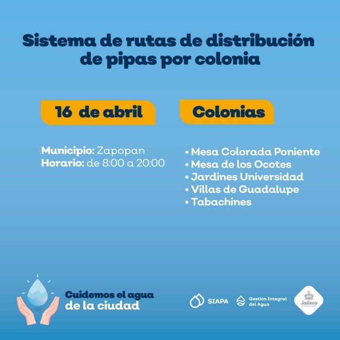 El Sistema Intermunicipal de los Servicios de Agua Potable y Alcantarillado (SIAPA) continúa con el sistema de rutas de pipas gratuitas por colonia implementado desde el pasado 18 de marzo, debido a que prevalece la baja presión de agua en algunas áreas de la Zona Metropolitana de Guadalajara (ZMG).Este día la flota de pipas acudirá a cinco colonias del municipio de Zapopan.La distribución de pipas tiene el objetivo de mitigar las afectaciones de las colonias que se encuentran dentro del operativo de suministro rotatorio, estrategia de distribución diseñada debido a la escasez de agua en la Presa Calderón.Las zonas de cobertura y horarios de la flota de pipas para este viernes 16 de abril es el siguiente:La distribución estará dentro de un horario de 08:00 a 20:00 horas. Ante el desabasto de agua el SIAPA exhorta a cuidar el vital líquido.Para solicitar pipas gratuitas se puede llamar a la línea telefónica SIAPATEL 3668-2482 con atención las 24 horas del día o a través de las redes sociales oficiales Facebook: Siapagdl y Twitter: @siapagdl.NR