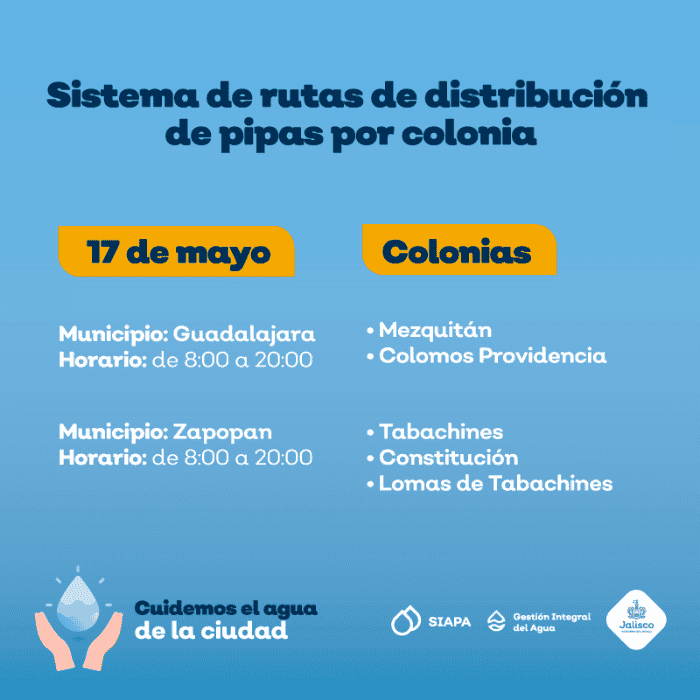 Ante la baja presión de agua que prevalece en algunas colonias de la Zona Metropolitana de Guadalajara (ZMG), el Sistema Intermunicipal de los Servicios de Agua Potable y Alcantarillado (SIAPA) continúa con el sistema de rutas de pipas gratuitas implementado desde el pasado 18 marzo. Este lunes se atenderá a colonias de Guadalajara y Zapopan.La distribución de pipas tiene el objetivo de minimizar las afectaciones a las colonias que se encuentran dentro del operativo de suministro rotatorio, estrategia diseñada debido a la escasez de agua en la Presa Calderón.Las zonas de cobertura y horarios de la flota de pipas para este lunes 17 de mayo son los siguientes:La distribución estará dentro de un horario de 08:00 a 20:00 horas. Ante el desabasto de agua el SIAPA exhorta a cuidar el vital líquido.Para atender el desabasto, el SIAPA informó que además ha colocado 143 cisternas comunitarias, de 10 mil litros de capacidad, en colonias de las zonas altas que cada año han tenido deficiencias en el servicio: 116 Zapopan, 13 en Guadalajara, 11 en Tonalá y tres en Tlaquepaque. Para consultar la ubicación de cisternas se puede ingresar a: gobjal.mx/Cisternas.Para solicitar el servicio de pipas gratuitas se requiere:También se puede llamar a la línea telefónica SIAPATEL 3668-2482 con atención las 24 horas del día.Asimismo, el SIAPA pone a disposición sus redes sociales en Twitter: @siapagl y Facebook: siapagdl para brindar informado sobre el sistema de rutas de distribución de pipas gratuitas por colonia y el SIAPATEL para denuncias (33 3668 2482).NR