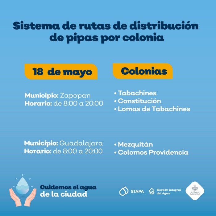 El Sistema Intermunicipal de los Servicios de Agua Potable y Alcantarillado (SIAPA) continúa con el sistema de rutas de pipas gratuitas por colonia implementado desde el pasado 18 de marzo, debido a que prevalece la baja presión de agua en algunas áreas de la Zona Metropolitana de Guadalajara (ZMG).Este día la flota de pipas acudirá a cinco colonias de los municipio de Zapopan y Guadalajara.La distribución de pipas tiene el objetivo de minimizar las afectaciones a las colonias que se encuentran dentro del operativo de suministro rotatorio, estrategia diseñada debido a la escasez de agua en la Presa Calderón.Las zonas de cobertura y horarios de la flota de pipas para este martes 18 de mayo son los siguientes:La distribución estará dentro de un horario de 08:00 a 20:00 horas. Ante el desabasto de agua el SIAPA exhorta a cuidar el vital líquido.El SIAPA informó además que ha colocado 143 cisternas comunitarias, de 10 mil litros de capacidad, en colonias de las zonas altas que cada año han tenido deficiencias en el servicio: 116 Zapopan, 13 en Guadalajara, 11 en Tonalá y tres en Tlaquepaque. Para consultar la ubicación de cisternas se puede ingresar a: gobjal.mx/Cisternas. Para solicitar el servicio de pipas gratuitas se requiere:También se puede llamar a la línea telefónica SIAPATEL 3668-2482 con atención las 24 horas del día.Asimismo, el SIAPA pone a disposición sus redes sociales en Twitter: @siapagl y Facebook: siapagdl para brindar informado sobre el sistema de rutas de distribución de pipas gratuitas por colonia y el SIAPATEL para denuncias (33 3668 2482).NR