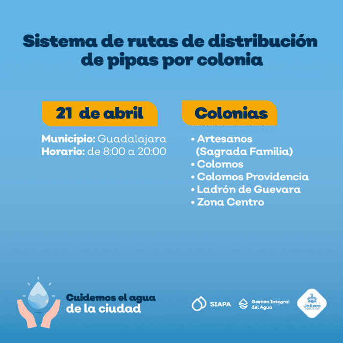 Ante la baja presión de agua que prevalece en algunas colonias de la Zona Metropolitana de Guadalajara (ZMG), el Sistema Intermunicipal de los Servicios de Agua Potable y Alcantarillado (SIAPA) continúa con el sistema de rutas de pipas gratuitas. Este día se atenderá a cinco colonias de Guadalajara.La distribución de pipas tiene el objetivo de minimizar las afectaciones a las colonias que se encuentran dentro del operativo de suministro rotatorio, estrategia diseñada debido a la escasez de agua en la Presa Calderón.Las zonas de cobertura y horarios de la flota de pipas para este miércoles 21 de abril es el siguiente:La distribución estará dentro de un horario de 08:00 a 20:00 horas. Ante el desabasto de agua el SIAPA exhorta a cuidar el vital líquido.Para solicitar el servicio de pipas gratuitas se requiere:También se puede llamar a la línea telefónica SIAPATEL 3668-2482 con atención las 24 horas del día o a través de las redes sociales oficiales Facebook: Siapagdl y Twitter: @siapagdl.NR
