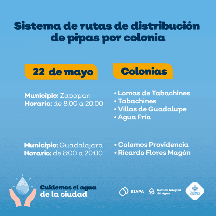 Ante la baja presión de agua que prevalece en algunas colonias de la Zona Metropolitana de Guadalajara (ZMG), el Sistema Intermunicipal de los Servicios de Agua Potable y Alcantarillado (SIAPA) continúa con el sistema de rutas de pipas gratuitas implementado desde el pasado 18 marzo. Este día se atenderá a cinco colonias de Guadalajara y Zapopan.La distribución de pipas tiene el objetivo de minimizar las afectaciones a las colonias que se encuentran dentro del operativo de suministro rotatorio, estrategia diseñada debido a la escasez de agua en la Presa Calderón.Las zonas de cobertura y horarios de la flota de pipas para este sábado 22 de mayo son los siguientes:La distribución estará dentro de un horario de 08:00 a 20:00 horas. Ante el desabasto de agua el SIAPA exhorta a cuidar el vital líquido.El SIAPA informó además que ha colocado 143 cisternas comunitarias, de 10 mil litros de capacidad, en colonias de las zonas altas que cada año han tenido deficiencias en el servicio: 116 Zapopan, 13 en Guadalajara, 11 en Tonalá y tres en Tlaquepaque. Para consultar la ubicación de cisternas se puede ingresar a: gobjal.mx/Cisternas.Para solicitar el servicio de pipas gratuitas se requiere:También se puede llamar a la línea telefónica SIAPATEL 3668-2482 con atención las 24 horas del día.Asimismo, el SIAPA pone a disposición sus redes sociales en Twitter: @siapagl y Facebook: siapagdl para brindar informado sobre el sistema de rutas de distribución de pipas gratuitas por colonia y el SIAPATEL para denuncias (33 3668 2482).NR