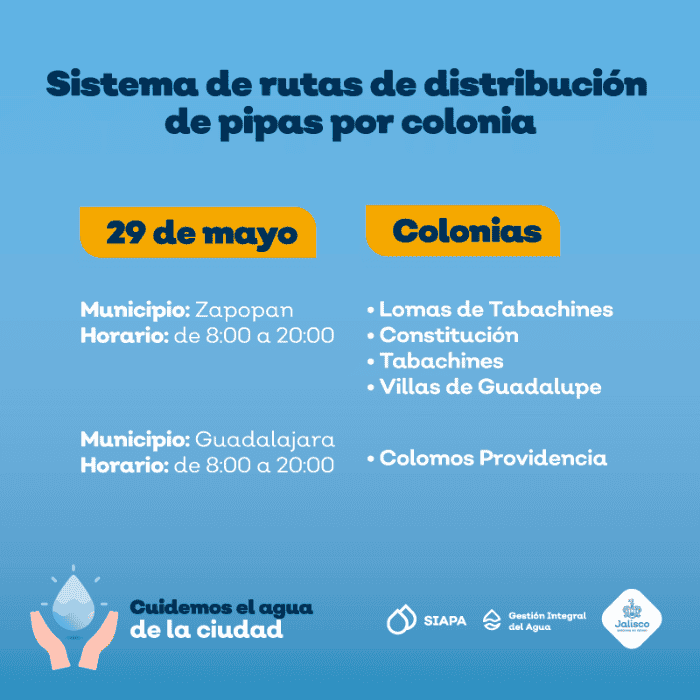 El Sistema Intermunicipal de los Servicios de Agua Potable y Alcantarillado (SIAPA) continúa con el sistema de rutas de pipas gratuitas por colonia implementado desde el pasado 18 de marzo, debido a que prevalece la baja presión de agua en algunas áreas de la Zona Metropolitana de Guadalajara (ZMG).Este día la flota de pipas acudirá a cinco colonias de los municipios de Zapopan y Guadalajara.La distribución de pipas tiene el objetivo de minimizar las afectaciones a las colonias que se encuentran dentro del operativo de suministro rotatorio, estrategia diseñada debido a la escasez de agua en la Presa Calderón.Las zonas de cobertura y horarios de la flota de pipas para este sábado 29 de mayo son los siguientes:La distribución estará dentro de un horario de 08:00 a 20:00 horas. Ante el desabasto de agua el SIAPA exhorta a cuidar el vital líquido.El SIAPA informó además que ha colocado 143 cisternas comunitarias, de 10 mil litros de capacidad, en colonias de las zonas altas que cada año han tenido deficiencias en el servicio: 116 Zapopan, 13 en Guadalajara, 11 en Tonalá y tres en Tlaquepaque. Para consultar la ubicación de cisternas se puede ingresar a: gobjal.mx/Cisternas.Para solicitar el servicio de pipas gratuitas se requiere:También se puede llamar a la línea telefónica SIAPATEL 3668-2482 con atención las 24 horas del día.Asimismo, el SIAPA pone a disposición sus redes sociales en Twitter: @siapagl y Facebook: siapagdl para brindar informado sobre el sistema de rutas de distribución de pipas gratuitas por colonia y el SIAPATEL para denuncias (33 3668 2482).NR