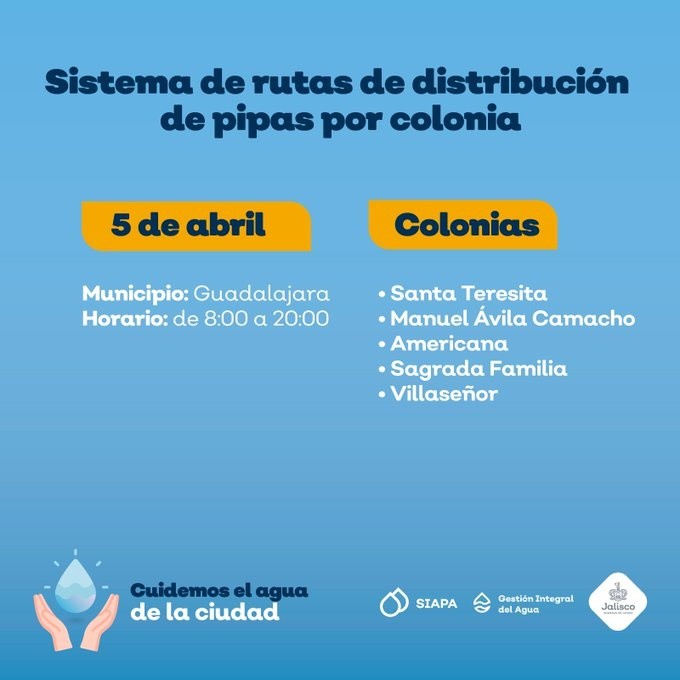 Ante la falta de agua en algunos municipios de la Zona Metropolitana de Guadalajara, el Sistema Intermunicipal de los Servicios de Agua Potable y Alcantarillado (SIAPA) continúa con el servicio de pipas gratuitas en algunas colonias.La distribución de pipas tiene el objetivo de minimizar las afectaciones a las colonias que se encuentran dentro del operativo de suministro rotatorio, estrategia de distribución diseñada debido a la escasez de agua en la Presa Calderón. Las zonas de cobertura y horarios de la flota de pipas para hoy 5 de abril es el siguiente:Guadalajara:La distribución estará dentro de un horario de 08:00 a 20:00 horas. Ante el desabasto de agua el SIAPA exhorta a cuidar el vital líquido.