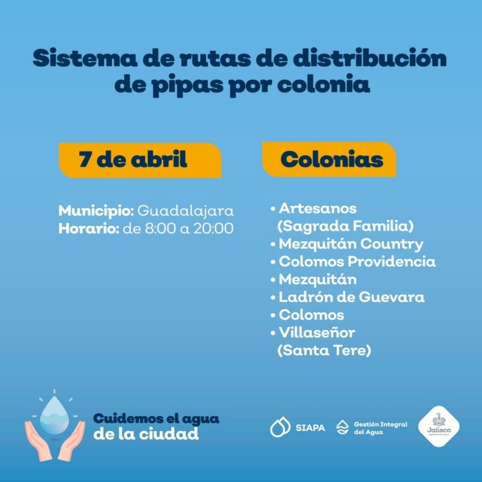 El Sistema Intermunicipal de los Servicios de Agua Potable y Alcantarillado (SIAPA) continúa con el sistema de rutas de pipas gratuitas por colonia implementado desde el pasado 18 de marzo, debido a que prevalece la baja presión de agua en algunas áreas de la Zona Metropolitana de Guadalajara (ZMG).La distribución de pipas tiene el objetivo de minimizar las afectaciones a las colonias que se encuentran dentro del operativo de suministro rotatorio, estrategia de distribución diseñada debido a la escasez de agua en la Presa Calderón.Las zonas de cobertura y horarios de la flota de pipas para este miércoles 7 de abril es el siguiente:La distribución estará dentro de un horario de 08:00 a 20:00 horas. Ante el desabasto de agua el SIAPA exhorta a cuidar el vital líquido.NR