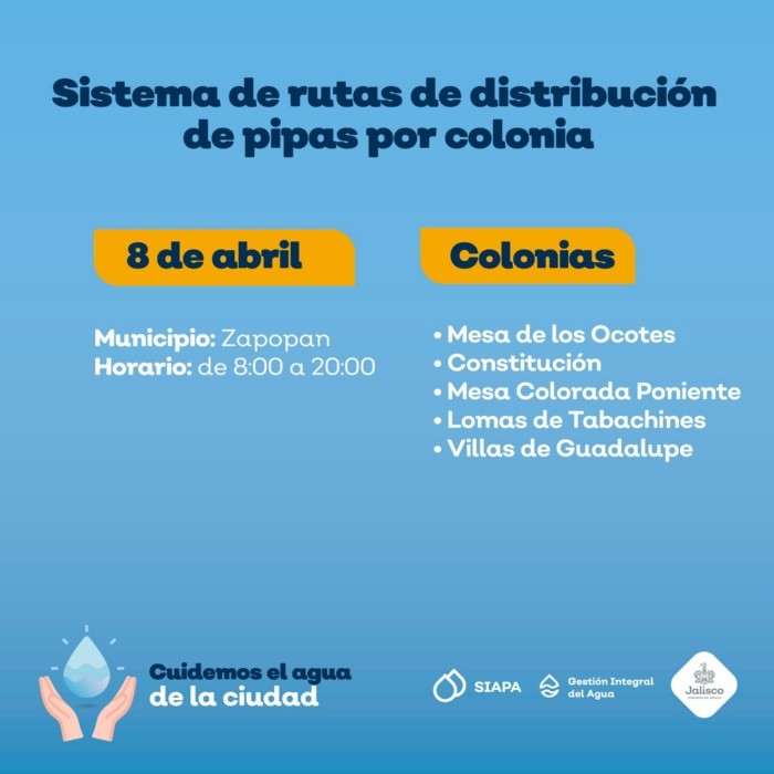 Ante la baja presión de agua que prevalece en algunas colonias de la Zona Metropolitana de Guadalajara (ZMG), el Sistema Intermunicipal de los Servicios de Agua Potable y Alcantarillado (SIAPA) continúa con el sistema de rutas de pipas gratuitas. Este día se atenderá a cinco colonias de Zapopan.La distribución de pipas tiene el objetivo de minimizar las afectaciones a las colonias que se encuentran dentro del operativo de suministro rotatorio, estrategia de distribución diseñada debido a la escasez de agua en la Presa Calderón.Las zonas de cobertura y horarios de la flota de pipas para este jueves 8 de abril es el siguiente:La distribución estará dentro de un horario de 08:00 a 20:00 horas. Ante el desabasto de agua el SIAPA exhorta a cuidar el vital líquido.NR