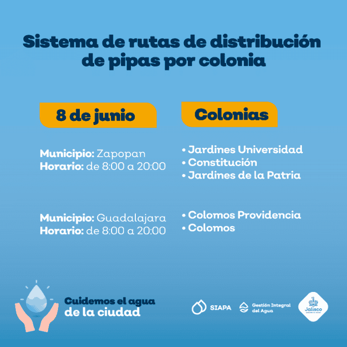 El Sistema Intermunicipal de los Servicios de Agua Potable y Alcantarillado (SIAPA) continúa con el sistema de rutas de pipas gratuitas por colonia implementado desde el pasado 18 de marzo, debido a que prevalece la baja presión de agua en algunas áreas de la Zona Metropolitana de Guadalajara (ZMG).Este día la flota de pipas acudirá a cinco colonias de los municipios de Zapopan y Guadalajara.La distribución de pipas tiene el objetivo de minimizar las afectaciones a las colonias que se encuentran dentro del operativo de suministro rotatorio, estrategia diseñada debido a la escasez de agua en la Presa Calderón.Las zonas de cobertura y horarios de la flota de pipas para este martes 8 de junio son los siguientes:La distribución estará dentro de un horario de 08:00 a 20:00 horas. Ante el desabasto de agua el SIAPA exhorta a cuidar el vital líquido.El SIAPA informó además que ha colocado 143 cisternas comunitarias, de 10 mil litros de capacidad, en colonias de las zonas altas que cada año han tenido deficiencias en el servicio: 116 Zapopan, 13 en Guadalajara, 11 en Tonalá y tres en Tlaquepaque. Para consultar la ubicación de cisternas se puede ingresar a: gobjal.mx/Cisternas. Para solicitar el servicio de pipas gratuitas se requiere:También se puede llamar a la línea telefónica SIAPATEL 3668-2482 con atención las 24 horas del día.Asimismo, el SIAPA pone a disposición sus redes sociales en Twitter: @siapagl y Facebook: siapagdl para brindar informado sobre el sistema de rutas de distribución de pipas gratuitas por colonia y el SIAPATEL para denuncias (33 3668 2482).NR