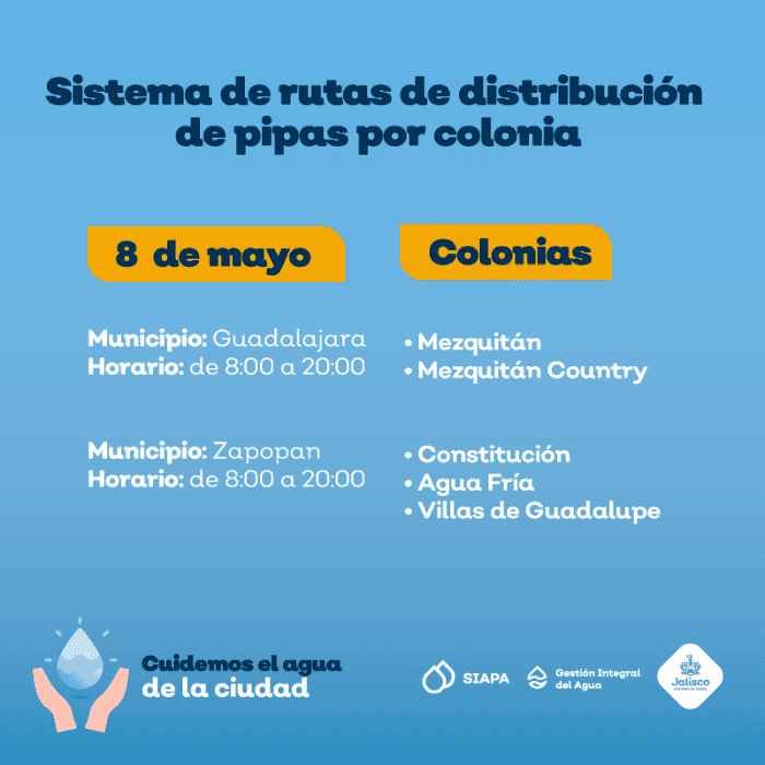 Ante la baja presión de agua que prevalece en algunas colonias de la Zona Metropolitana de Guadalajara (ZMG), el Sistema Intermunicipal de los Servicios de Agua Potable y Alcantarillado (SIAPA) continúa con el sistema de rutas de pipas gratuitas implementado desde el pasado 18 marzo. Este día se atenderá a cinco colonias de Guadalajara y Zapopan.La distribución de pipas tiene el objetivo de minimizar las afectaciones a las colonias que se encuentran dentro del operativo de suministro rotatorio, estrategia diseñada debido a la escasez de agua en la Presa Calderón.Las zonas de cobertura y horarios de la flota de pipas para este sábado 8 de mayo son los siguientes:La distribución estará dentro de un horario de 08:00 a 20:00 horas. Ante el desabasto de agua el SIAPA exhorta a cuidar el vital líquido.Además, desde el pasado 6 de mayo 20 colonias cuentan con el servicio de pipas de agua gratuitas de manera permanente, estas son las siguientes:De igual manera, el SIAPA informó que ha colocado 143 cisternas comunitarias, de 10 mil litros de capacidad, en colonias de las zonas altas que cada año han tenido deficiencias en el servicio: 116 Zapopan, 13 en Guadalajara, 11 en Tonalá y tres en Tlaquepaque. Para consultar la ubicación de cisternas se puede ingresar a: gobjal.mx/Cisternas. Para solicitar el servicio de pipas gratuitas se requiere:También se puede llamar a la línea telefónica SIAPATEL 3668-2482 con atención las 24 horas del día.Asimismo, el SIAPA pone a disposición sus redes sociales en Twitter: @siapagl y Facebook: siapagdl para brindar informado sobre el sistema de rutas de distribución de pipas gratuitas por colonia y el SIAPATEL para denuncias (33 3668 2482).NR