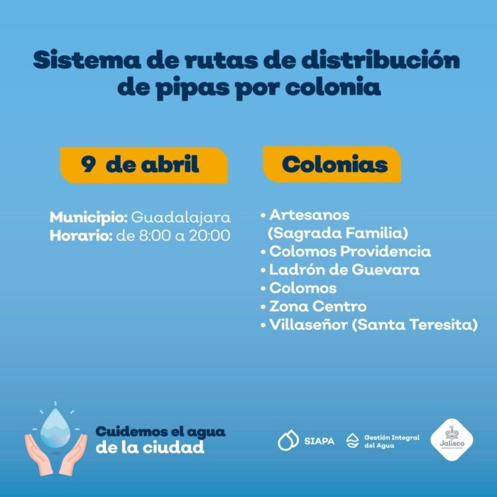 Ante la baja presión de agua que prevalece en algunas colonias de la Zona Metropolitana de Guadalajara (ZMG), el Sistema Intermunicipal de los Servicios de Agua Potable y Alcantarillado (SIAPA) continúa con el sistema de rutas de pipas gratuitas. Este día se atenderá a seis colonias de Guadalajara. La distribución de pipas tiene el objetivo de minimizar las afectaciones a las colonias que se encuentran dentro del operativo de suministro rotatorio, estrategia de distribución diseñada debido a la escasez de agua en la Presa Calderón.Las zonas de cobertura y horarios de la flota de pipas para este viernes 9 de abril es el siguiente:La distribución estará dentro de un horario de 08:00 a 20:00 horas. Ante el desabasto de agua el SIAPA exhorta a cuidar el vital líquido.NR
