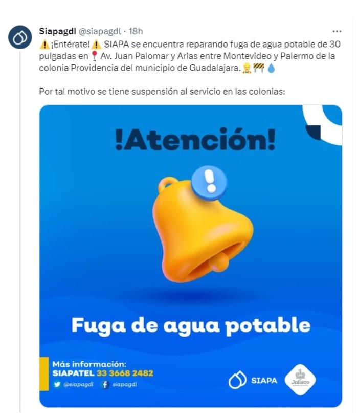 El Sistema Intermunicipal de los Servicios Agua Potable y Alcantarillado (Siapa) reportó en las últimas horas que habrá otro corte de agua en plena ola de calor en 15 colonias de Guadalajara. A través de sus redes sociales, Siapa reportó que se encuentra reparando una fuga de agua potable de 30 pulgadas en la Avenida Juan Palomar y Arias entre Montevideo y Palermo de la colonia Providencia del municipio de Guadalajara. Por tal motivo se verán afectadas las siguientes 15 colonias: El servicio de agua regresará a su normalidad durante la tarde del lunes 19 de junio. En caso de cualquier duda o aclaración, el Siapa pone a disposición los siguientes medios para que resuelvas tus preguntas.MF