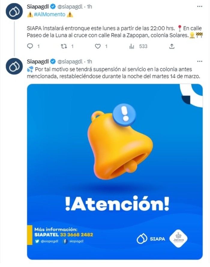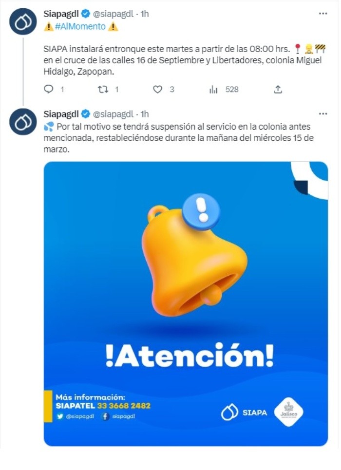 Este martes, el Sistema Intermunicipal de los Servicios Agua Potable y Alcantarillado (Siapa) reportó por medio de sus redes sociales que habrá corte de agua en dos colonias de Zapopan debido a que se instalarán dos entronques en calles de dicho municipio. Siapa informó en su cuenta de Twitter que los entronques serán instalados en dos colonias distintas.El primero será este lunes a partir de las 22:00 horas en la calle Paseo de la Luna al cruce con calle Real a Zapopan, en la colonia Solares, por lo que suspenderá el servicio en dicha colonia ya mencionada y se restablecerá durante la noche del martes 14 de marzo. La segunda reparación será este martes a partir de las 08:00 horas en el cruce de las calles 16 de Septiembre y Libertadores, en la colonia Miguel Hidalgo, Zapopan, por tal motivo habrá corte de agua en este punto y regresará a su normalidad durante la noche del miércoles 15 de marzo. Ante cualquier duda o alguna aclaración, el Siapa pone a disposición los siguientes medios para que resuelvas tus preguntas.MF