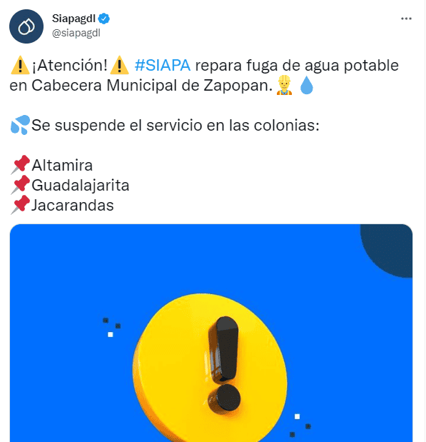 El Sistema Intermunicipal de los Servicios de Agua Potable y Alcantarillado (SIAPA) anunció la mañana de hoy miércoles que habrá corte de agua para ocho colonias del municipio de Zapopan.A través de redes sociales, el SIAPA informó que personal se encuentra reparando una fuga de agua que se registró en la cabecera municipal de Zapopan. Debido a esto, deberán realizar cortes de agua en algunas colonias de dicho municipio.Se prevé que el servicio regrese durante la tarde del jueves 21 de julio.El SIAPA invitó a la gente a realizar distintas acciones para el uso responsable y óptimo del aguaAnte cualquier duda o aclaración, el SIAPA pone a disposición los siguientes medios para que resuelvas tus preguntas. Facebook: siapagdl Twitter: siapagdl SIAPATEL: 3336682482GC