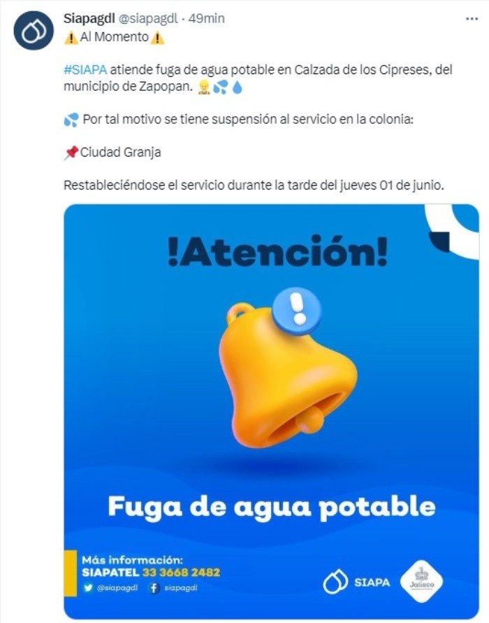 La tarde de este miércoles, el Sistema Intermunicipal de los Servicios Agua Potable y Alcantarillado (Siapa) informó que habrá corte de agua en una colonia de Zapopan debido a que se encuentra en reparación un fuga. Fue a través de sus redes sociales donde Siapa informó que se atiende una fuga de agua potable en Calzada de los Cipreses, del municipio de Zapopan.Por tal motivo se verá afectada la colonia Ciudad Granja. El servicio de agua potable regresará a su normalidad durante la tarde del jueves 1 de junio. El día de ayer 30 de mayo otras colonias se vieron afectadas con un corte de agua que son: Infonavit Estadio, Santa Isabel y San Patricio. Se espera que durante la tarde hoy 31 de mayo regrese el servicio a su normalidad. En caso de cualquier duda o alguna aclaración, el Siapa pone a disposición los siguientes medios para que resuelvas tus preguntas.MF
