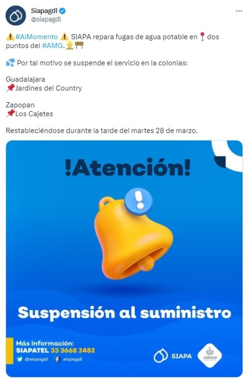Este lunes el Sistema Intermunicipal de los Servicios de Agua Potable y Alcantarillado (Siapa) anunció que habrá corte de agua en dos colonias de la Zona Metropolitana de Guadalajara (ZMG) debido a que se presentaron dos fugas de agua en distintos puntos. A través de las redes sociales, Siapa informó que una de las fugas de agua se presentó en Guadalajara afectando la colonia Jardines del Country, mientras que la segunda fuga fue en Zapopan en la colonia Los Cajetes. Por tal motivo se tuvo que suspender el servicio de agua potable y regresará a su normalidad durante la tarde del martes 28 de marzo. En caso de tener cualquier duda o alguna aclaración, el Siapa pone a disposición los siguientes medios para que resuelvas tus preguntas. MF