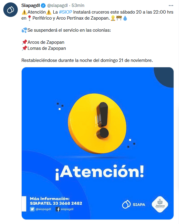 El Sistema Intermunicipal de los Servicios de Agua Potable y Alcantarillado (SIAPA) anunció la mañana de este sábado que habrá corte de agua para dos colonias del municipio de Zapopan.A través de sus redes sociales, el SIAP dio a conocer que: "La #SIOP instalará cruceros este sábado 20 a las 22:00 hrs en Periférico y Arco Pertinax de Zapopan".Explica que por ese motivo, se suspenderá el servicio en las colonias:Y detalla que el servicio se restablecerá durante la noche del domingo 21 de noviembre,El SIAPA invita a la gente a realizar distintas acciones para el uso responsable y óptimo del agua. Entre las medidas sugiere que:Ante cualquier duda o aclaración, el SIAPA pone a disposición los siguientes medios para que resuelvas tus preguntas.OF