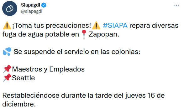 El Sistema Intermunicipal de los Servicios de Agua Potable y Alcantarillado (SIAPA) anunció la mañana de hoy miércoles que habrá corte de agua para dos colonias del municipio de Zapopan.A través de redes sociales, el SIAPA informó que debido a esto deberán realizar cortes de agua en algunas colonias, sin embargo, se prevé normalizar el servicio durante la tarde de mañana jueves 16 de diciembre.El SIAPA invitó a la gente a realizar distintas acciones para el uso responsable y óptimo del aguaAnte cualquier duda o aclaración, el SIAPA pone a disposición los siguientes medios para que resuelvas tus preguntas. Facebook: siapagdl Twitter: siapagdl SIAPATEL: 3336682482GC