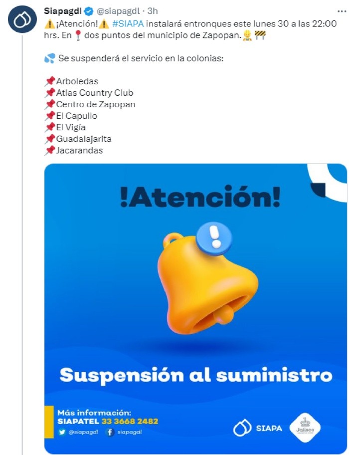 El Sistema Intermunicipal de los Servicios Agua Potable y Alcantarillado (SIAPA) dio a conocer a través de sus redes sociales que se suspenderá el servicio de agua en ciertas colonias del municipio de Zapopan.Siapa informó que este lunes 30 de enero instalarán entronques a las 22:00 horas, en dos puntos distintos del municipio.A continuación te dejamos la lista de las colonias que se verán afectadas:Los servicios de agua regresarán a su normalidad durante la noche del martes 31 de enero, así lo informó el Siapa en la misma publicación en su cuenta de Twitter. Para cualquier duda o aclaración sobre los servicios, el Siapa pone a disposición sus redes sociales y número telefónico para resolver las preguntas de sus ciudadanos. MF