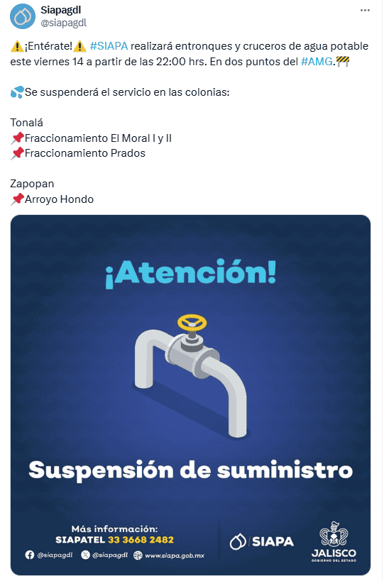 Este jueves, el Sistema Intermunicipal de los Servicios de Agua Potable y Alcantarillado (SIAPA) reportó que habrá corte de agua en algunas colonias de los municipios de Tonalá y Zapopan. A través de las redes sociales, el SIAPA informó que realizará entronques y cruceros de agua potable este viernes 14 a partir de las 22:00 horas en dos puntos de la Zona Metropolitana de Guadalajara. Por tal motivo se verán afectadas las siguientes colonias:Se espera que el servicio se restablezca durante la tarde del sábado 15 de marzo. Para cualquier duda o aclaración, el SIAPA pone a tu disposición diversos canales de comunicación para resolver tus inquietudes.MF