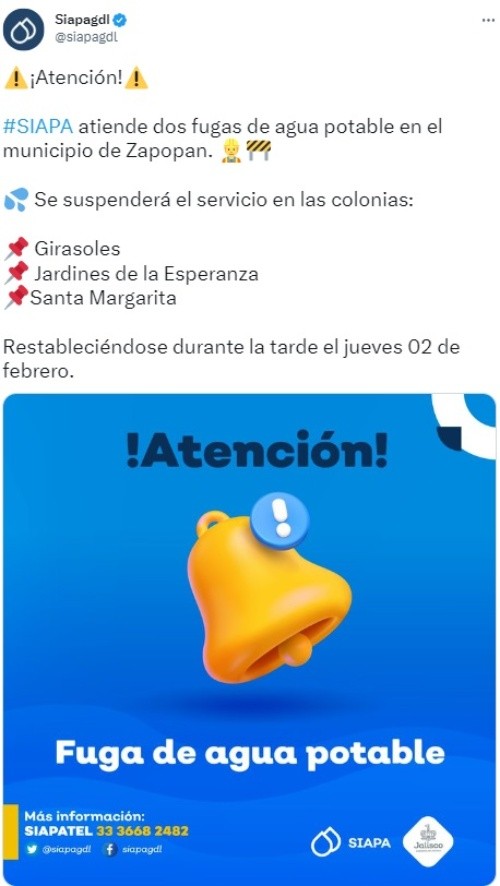 La tarde de este miércoles, el Sistema Intermunicipal de los Servicios Agua Potable y Alcantarillado (Siapa) informó a través de su cuenta de Twitter que se suspenderá el servicio en tres colonias de Zapopan. El corte de agua se debe a se encuentran reparando dos fugas de agua potable del municipio, por lo que las colonias Girasoles, Jardines de la Esperanza y Santa Margarita se verán afectadas. Siapa informó que el servicio se restablecerá durante la tarde de este jueves 2 febrero.Para cualquier duda o aclaración, el Siapa pone a disposición sus redes sociales y número telefónico para resolver las preguntas de sus ciudadanos. MF