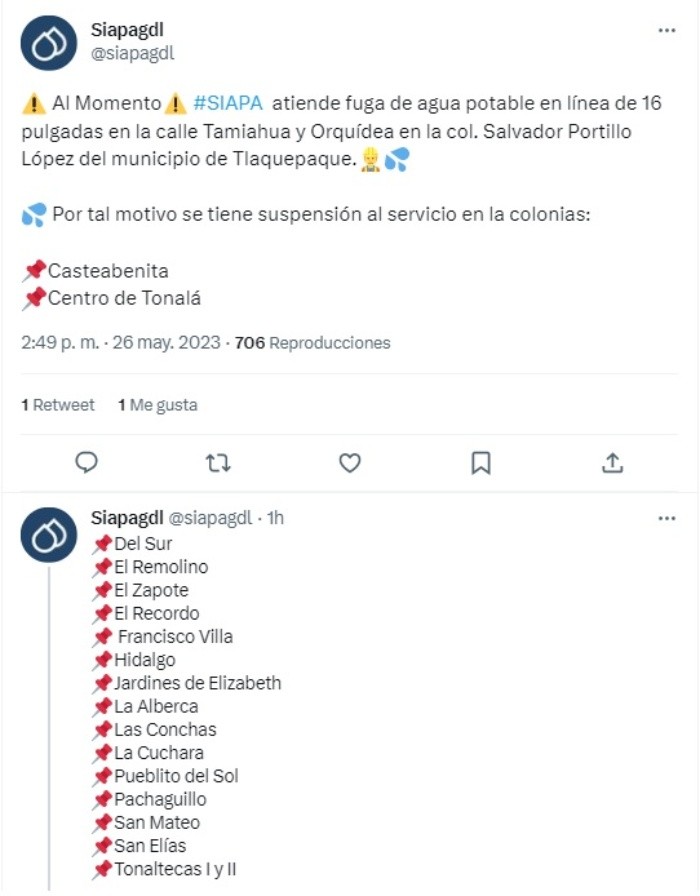 Este viernes el Sistema Intermunicipal de los Servicios Agua Potable y Alcantarillado (Siapa) dio a conocer que hay un corte de agua en varias colonias del municipio de Tlaquepaque.Fue a través de sus redes sociales en donde el Siapa informó que está suspendido el servicio de agua ya que se encuentran reparando una fuga de agua en la calle Tamiahua y Orquídea en la colonia Salvador Portillo López del municipio de Tlaquepaque. Por este motivo en 17 colonias habrá corte de agua; a continuación te dejamos la lista: El servicio de agua regresará a su normalidad la noche del sábado 26 de mayo.En caso de cualquier duda o alguna aclaración, el Siapa pone a disposición los siguientes medios para que resuelvas tus preguntas.MF