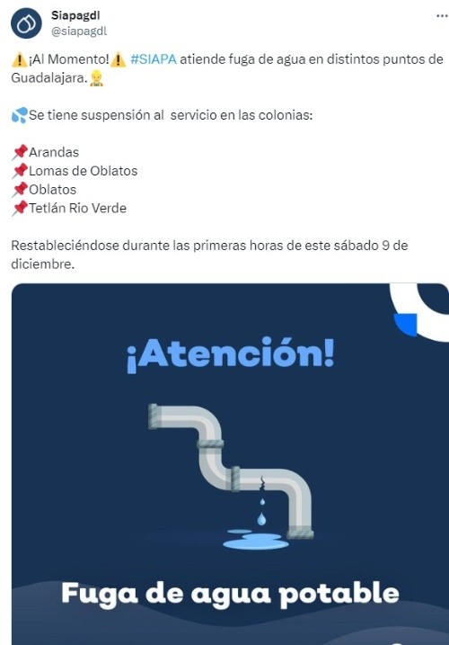 La tarde de este viernes, el Sistema Intermunicipal de los Servicios Agua Potable y Alcantarillado (Siapa) informó que habrá corte de agua en algunas colonias de los municipios de Guadalajara y Zapopan, por lo que hizo un llamado a tomar precauciones. Fue a través de sus redes sociales donde el Siapa informó que se atiende una fuga de agua en distintos puntos de Guadalajara, por tal motivo se suspenderá el servicio de agua potable en las siguientes colonias: Se espera que el servicio regrese a su normalidad durante la mañana del sábado 9 de diciembre. Por otro lado en el municipio de Zapopan se instalará entronque de 16 pulgadas este viernes 8 a las 22:00 horas en Periférico y San Juan en la colonia Ciudad Granja. Esto afectará el servicio de agua en las siguientes colonias de dicho municipio: El servicio se restablecerá durante la mañana del domingo 10 de diciembre.En caso de cualquier duda o aclaración, el Siapa pone a disposición los siguientes medios para que resuelvas tus preguntas.*Mantente al día con las noticias, únete a nuestro canal de WhatsApp MF