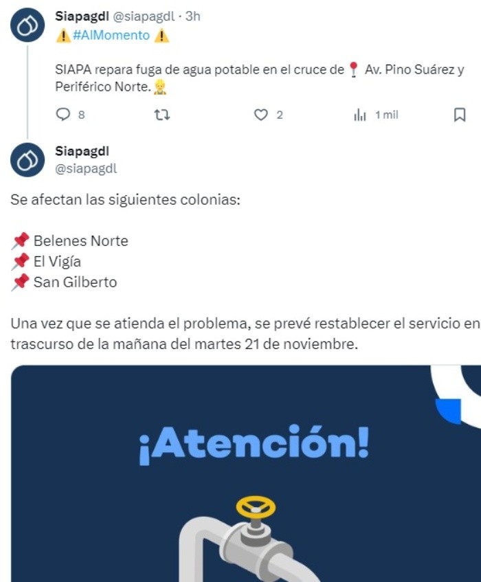 Este lunes, el Sistema Intermunicipal de los Servicios Agua Potable y Alcantarillado (Siapa) reportó que hay un corte de agua en algunas colonias de la Zona Metropolitana de Guadalajara.A través de sus redes sociales, el Siapa informó que se encuentra en reparación un fuga de agua potable en el cruce de Av. Pino Suárez y Periférico Norte, por tal motivo tres colonias no contarán con servicio; te decimos cuáles son: Se espera que el servicio de agua potable regrese a su normalidad durante el transcurso del día martes 21 de noviembre. En caso de cualquier duda o aclaración, el Siapa pone a disposición los siguientes medios para que resuelvas tus preguntas.*Mantente al día con las noticias, únete a nuestro canal de WhatsAppMF