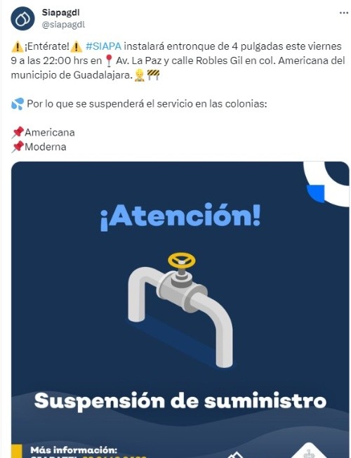 Este viernes, el Sistema Intermunicipal de los Servicios Agua Potable y Alcantarillado (Siapa) reportó que habrá otro corte de agua en dos colonias más del municipio de Guadalajara, por lo que hace un llamado a los usuarios a tomar sus precauciones. Fue a través de sus redes sociales, donde el Siapa informó que se instalará un entronque de 4 pulgadas este viernes 9 a las 22:00 horas en Av. La Paz y calle Robles Gil en colonia Americana del municipio de Guadalajara. Las colonias que no contarán con servicio de agua potable son dos; te decimos cuáles sonSiapa informó que el servicio se restablecerá durante la tarde del sábado 10 de febrero. En caso de cualquier duda o aclaración, el Siapa pone a disposición los siguientes medios para que resuelvas tus preguntas.MF