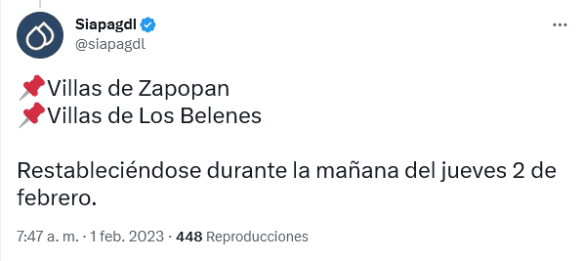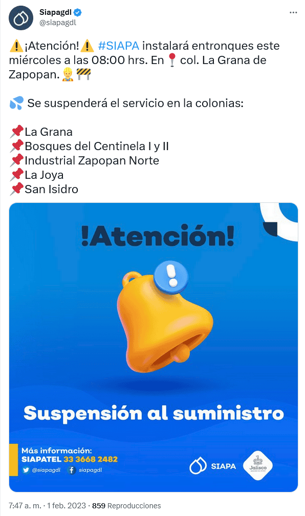 El Sistema Intermunicipal de los Servicios Agua Potable y Alcantarillado (Siapa) informó que instalará entronques este miércoles 1 de febrero a las 08:00 horas, en la colonia La Grana, por lo que el servicio será suspendido en siete colonias del municipio de Zapopan.Las afectadas serán las colonias La Grana, Bosques del Centinela I y II, Industrial Zapopan Norte, La Joya, San Isidro, Villas de Zapopan, y Villas de Los Belenes.En sus redes sociales, el Siapa indicó que el servicio se establecerá en el trascurso del día de mañana, jueves 2 de febrero.Ante cualquier duda o aclaración, el Siapa pone a disposición los siguientes medios para que resuelvas tus preguntas.***OF