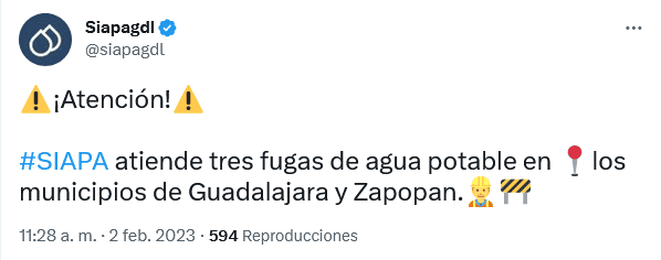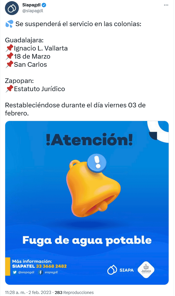 El Sistema Intermunicipal de los Servicios Agua Potable y Alcantarillado (Siapa) informó que atiende tres fugas de agua potable este jueves 2 de febrero, por lo que el servicio será suspendido en tres colonias del municipio de Guadalajara y una de Zapopan.Las afectadas serán las colonias Ignacio L. Vallarta, 18 de Marzo, y San Carlos en Guadalajara; mientras que en Zapopan, el servicio se suspenderá en la Estatuto Jurídico.En sus redes sociales, el Siapa indicó que el servicio se establecerá en el trascurso del día de mañana, viernes 3 de febrero.Ante cualquier duda o aclaración, el Siapa pone a disposición los siguientes medios para que resuelvas tus preguntas.***OF