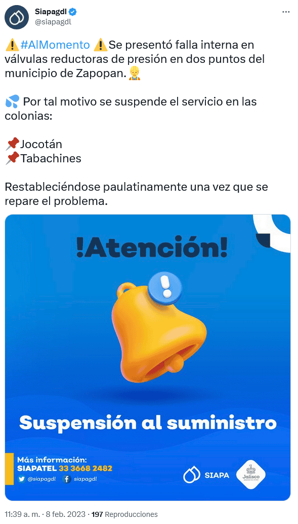 El Sistema Intermunicipal de los Servicios Agua Potable y Alcantarillado (Siapa) informó la falla interna en válvulas reductoras de presión en dos puntos del municipio de Zapopan este miércoles 8 de febrero, por lo que el servicio será suspendido en dos colonias.