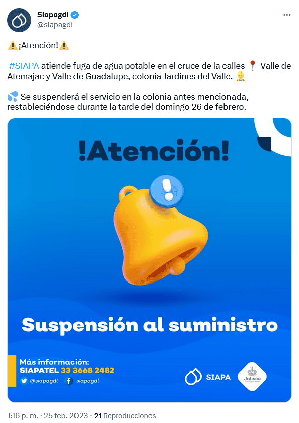El Sistema Intermunicipal de los Servicios Agua Potable y Alcantarillado (Siapa) informó que hoy sábado 25 de febrero se atiende fuga de agua potable en el cruce de la calles Valle de Atemajac y Valle de Guadalupe de la colonia Jardines del Valle, por lo que se suspenderá el servicio en la colonia antes mencionada. En sus redes sociales, el Siapa indicó que el servicio se restablecerá durante la tarde del domingo 26 de febrero.Ante cualquier duda o aclaración, el Siapa pone a disposición los siguientes medios para que resuelvas tus preguntas.***OF