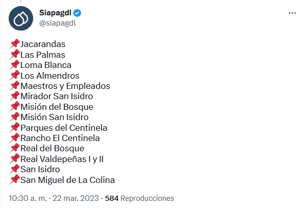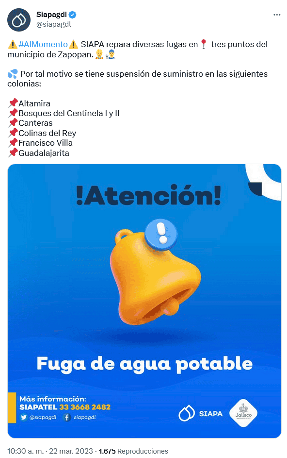El Sistema Intermunicipal de los Servicios Agua Potable y Alcantarillado (Siapa) informó que hoy 22 de marzo se reparan fugas en diferentes puntos del municipio de Zapopan, por lo que se suspenderá el servicio en más de 20 colonias.Las afectadas serán las colonias Altamira, Bosques del Centinela I y II, Canteras, Colinas del Rey, Francisco Villa, Guadalajarita, Jacarandas, Las Palmas, Loma Blanca, Los Almendros, Maestros y Empleados, Mirador San Isidro, Misión del Bosque, Misión San Isidro, Parques del Centinela, Rancho El Centinela, Real del Bosque, Real Valdepeñas I y II, San Isidro, San Miguel de La Colina, Santa Fe, Villa Palmas, y Villas de Zapopan.En sus redes sociales, el Siapa indicó que el servicio se restablecerá en el transcurso del jueves 23 de marzo.Ante cualquier duda o aclaración, el Siapa pone a disposición los siguientes medios para que resuelvas tus preguntas.***OF