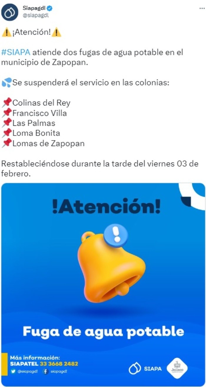 Fue a través de sus redes sociales donde el Siapa informó sobre las colonias que se verán afectadas con el servicio, las cuales son: Colinas del Rey, Francisco Villa, Las Palmas, Loma Bonita y Lomas de Zapopan.