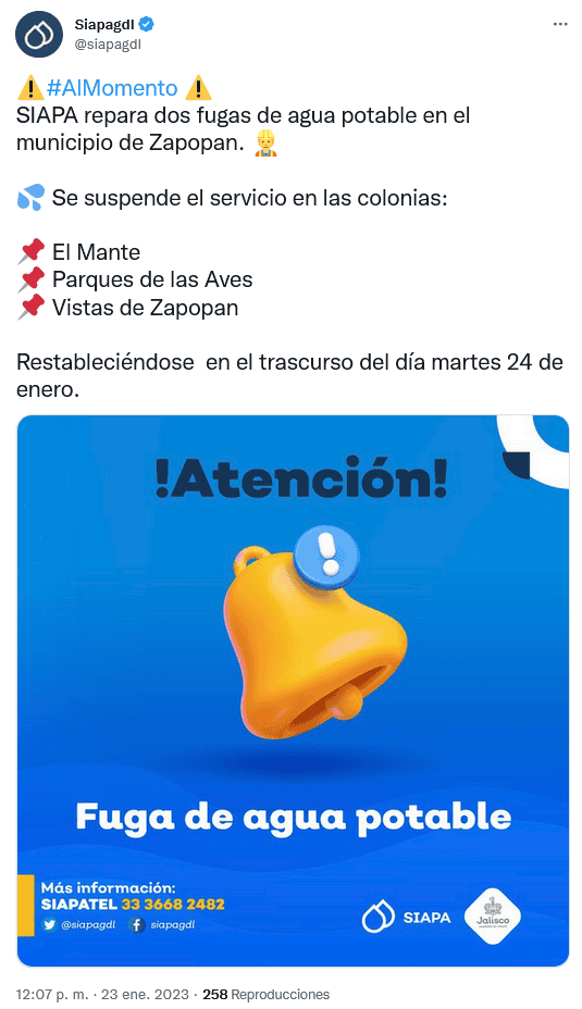 El Sistema Intermunicipal de los Servicios Agua Potable y Alcantarillado (Siapa) informó que repara dos fugas de agua potable en el municipio de Zapopan, por lo que el servicio será suspendido en tres colonias.Las afectadas serán las colonias El Mante, Parques de las Aves, y Vistas de Zapopan.En sus redes sociales, el Siapa indicó que el servicio se establecerá en el trascurso del día de mañana, martes 24 de enero.Ante cualquier duda o aclaración, el Siapa pone a disposición los siguientes medios para que resuelvas tus preguntas.***OF